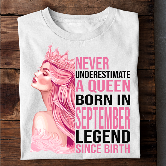 NEVER UNDERESTIMATE A QUEEN BORN IN SEPTEMBER LUXURY TSHIRT